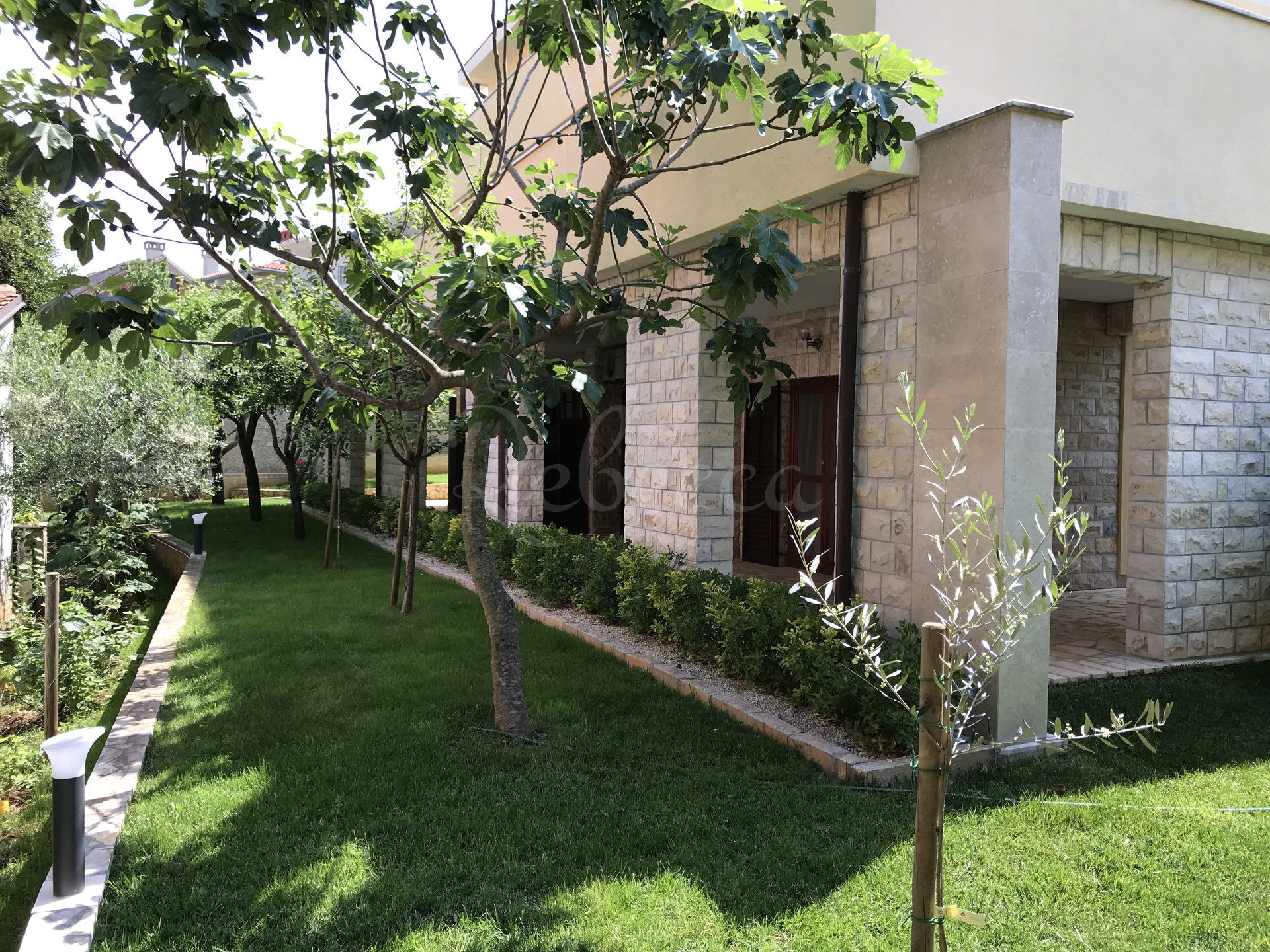 A beautiful house for sale in Pješčana uvala with a total area of 450 m2 spread over three floors. There are three studio apartments on the ground floor, each with a separate covered terrace. On the first floor it is comfortable with three bedrooms and one study, a living room with an exit to a large terrace, a kitchen with a dining room, a bathroom, a toilet and a spacious hall. While on the second floor there are two apartments each with two bedrooms, a living room with an exit to the terrace, kitchen with dining room and bathroom. In front of the house is a paved parking lot covered with a pergola, and within the house there is a garage with one parking space. A summer kitchen with a barbecue and a large covered terrace for pleasant gatherings in the open air are located on a beautifully landscaped garden. Everything is full of greenery and various flowers with a few olive and fig trees for a Mediterranean atmosphere. The house is located in an excellent location, a few minutes from the pebble beach.