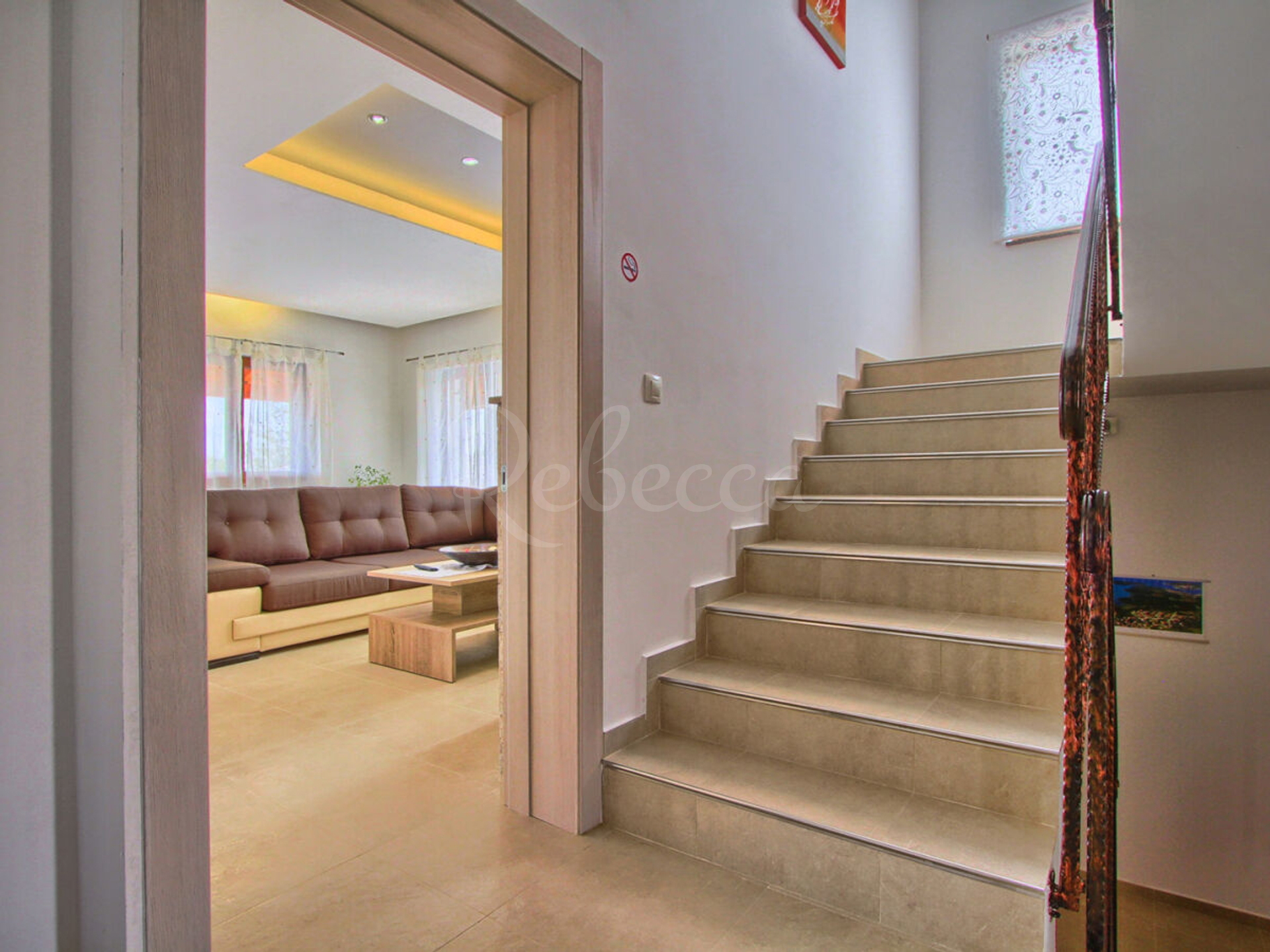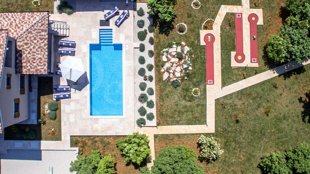 Svetvinčenat, nova kuća 294m2 sa bazenom, te velikom okućnicom od 1900m2. Kuća se nalazi na rubnom dijelu manjeg sela,gdje se pruža izuzetan pogled na prirodno zelenilo, te privatnost pri odmoru i relaksiranju u tišini. Objekat se sastoji od podruma,prizemlja, te prvog kata. - Podrum se sastoji od, multifunkcionalni prostor,fitness i druge sportske aktivnosti,te kotlovnica koja je predviđena za centralno grijanje na plin - Prizemlje se sastoji od, ulaznog hodnika, kuhinje,blagovaone,dnevnog boravka,jedne spavaće sobe sa svojom kupaonicom, te kupaonica za goste, predprostor za perilicu i sušilicu rublja - Prvi kat se sastoji od, tri spavaće sobe, te svaka soba ima svoj predprostor i kupaonicu. Iz jedne od navedenih soba ima i izlaz na lođu od 7m2 sa pogledom na bazen, te pogled na more u daljini. Na navedenoj okućnici se nalazi dječje multifunkcionalno igralište veličine 7, a sastoji se od ljuljačke, tobogana, penjalice i još nekoliko sadržaja. - minigolf na 6 rupa - multifunkcionalni teren (16x8m): mali nogomet, košarka, odbojka - hidromasažna kada 2,15 x 2,15 m za 5+1 osoba (natkrivena) - navodnjavanje dijela travnjaka