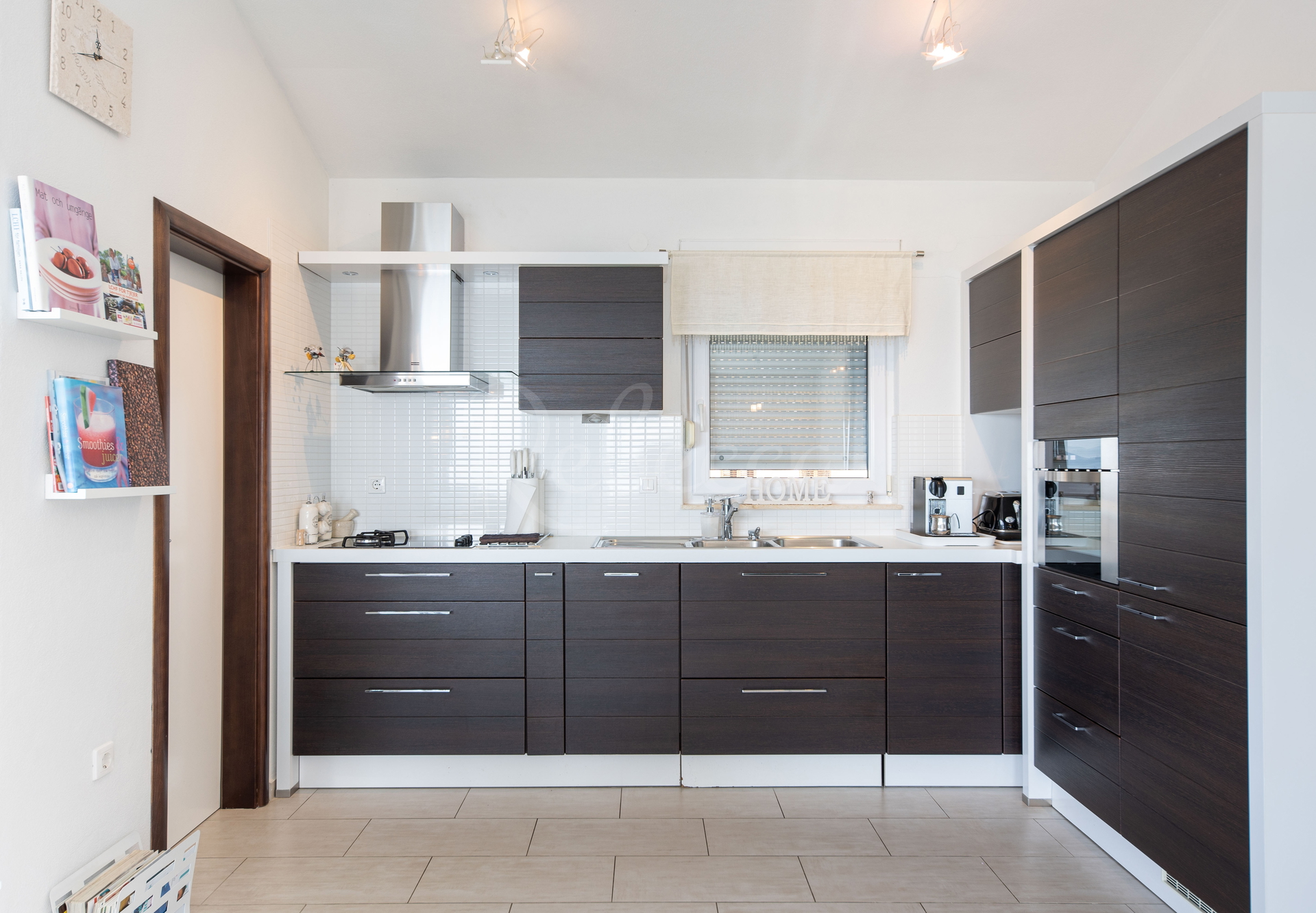 Questo spazioso appartamento si trova in un edificio residenziale più piccolo, ha una superficie di 90,45 m2, ed è composto da una cucina e sala da pranzo, un soggiorno, un disimpegno, due camere da letto, due bagni, una lavanderia/ripostiglio e una loggia di 9,27 m2. L'appartamento dispone inoltre di un posto auto di 11,50 mq. Il soggiorno si apre su un terrazzo con una meravigliosa vista sul mare. L'appartamento dispone anche di una parte di giardino ad uso comune, dove è presente un barbecue, una zona prendisole e una piscina privata. Completamente arredato e attrezzato.
